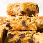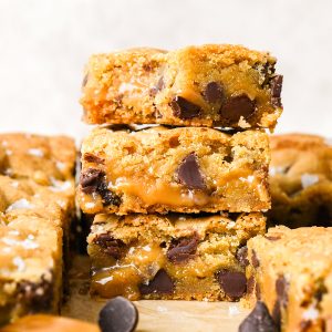 A buttery chocolate chip cookie bar is filled with a rich caramel filling then topped with flaky sea salt. They are crispy on the outside and gooey in the center – perfect served slightly warm with a scoop of vanilla ice cream.