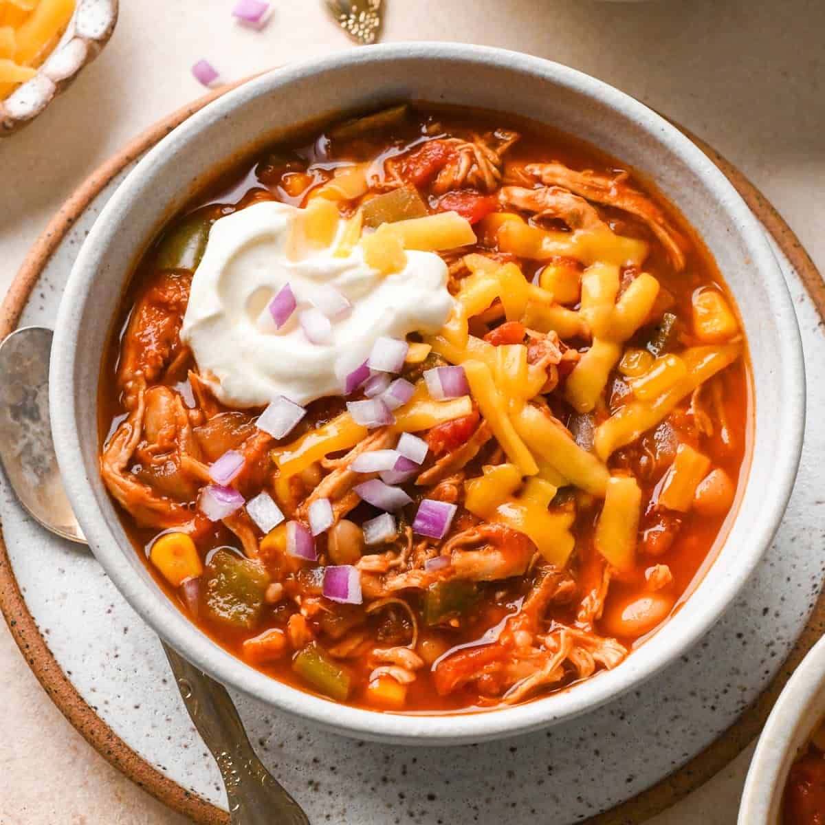 Serve this crock pot chicken chili with your favorite toppings and sides. Here are some suggestions: