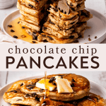 These fluffy chocolate chip pancakes are easy to make from scratch with simple ingredients. They are infused with hints of cinnamon and vanilla, and lots of chocolate chips!