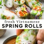 These fresh spring rolls are a light and healthy appetizer or main dish. Crunchy veggies, green onions, peanuts and cilantro are wrapped together then dipped in the most delicious peanut sauce!