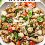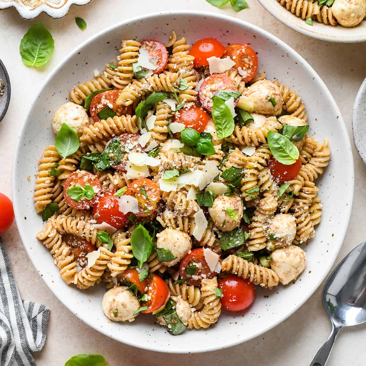 Caprese Pasta Salad in a bowl garnished with fresh basil and parmesan cheese