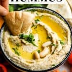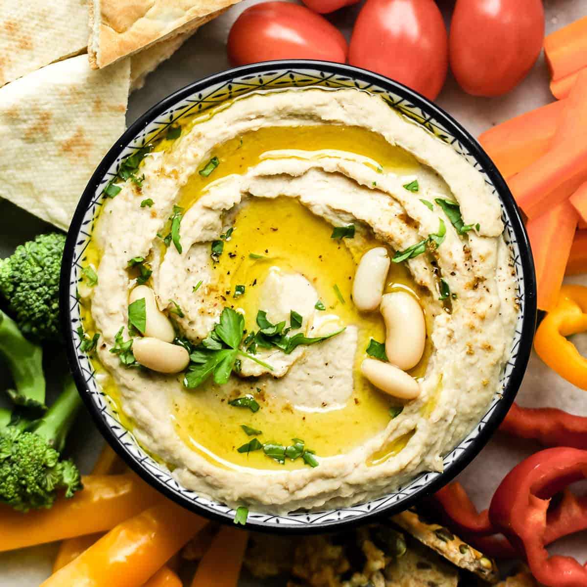 This homemade white bean hummus recipe is silky smooth and flavorful. It’s made with 5 ingredients in 5 minutes and is a delicious appetizer or side dish.