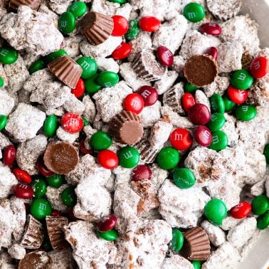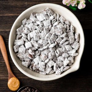 Serve this puppy chow recipe at room temperature or only slightly chilled. If it is in an environment that is too warm, it could start to melt, so be careful.