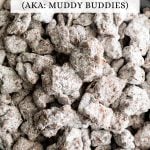 The Best Puppy Chow Recipe (AKA: Muddy Buddies) ever! Only 4 ingredients (no butter) and a few minutes results in an irresistible dessert loaded with chocolate and peanut butter! The perfect sweet treat to feed a crowd!