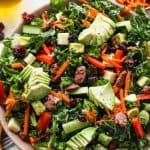 Add carrot, cucumber, red pepper, avocado, dried cranberries, nuts and seeds – saving about 1-2 Tablespoons of each ingredient to add to the top of the salad for presentation. Then, add the dressing and stir to combine.