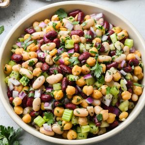 This 3 bean salad recipe is a light and flavorful side dish that takes less than 10 minutes to prepare. In this recipe, three types of beans are mixed with herbs and spices and tossed in a delicious homemade dressing!