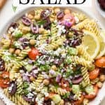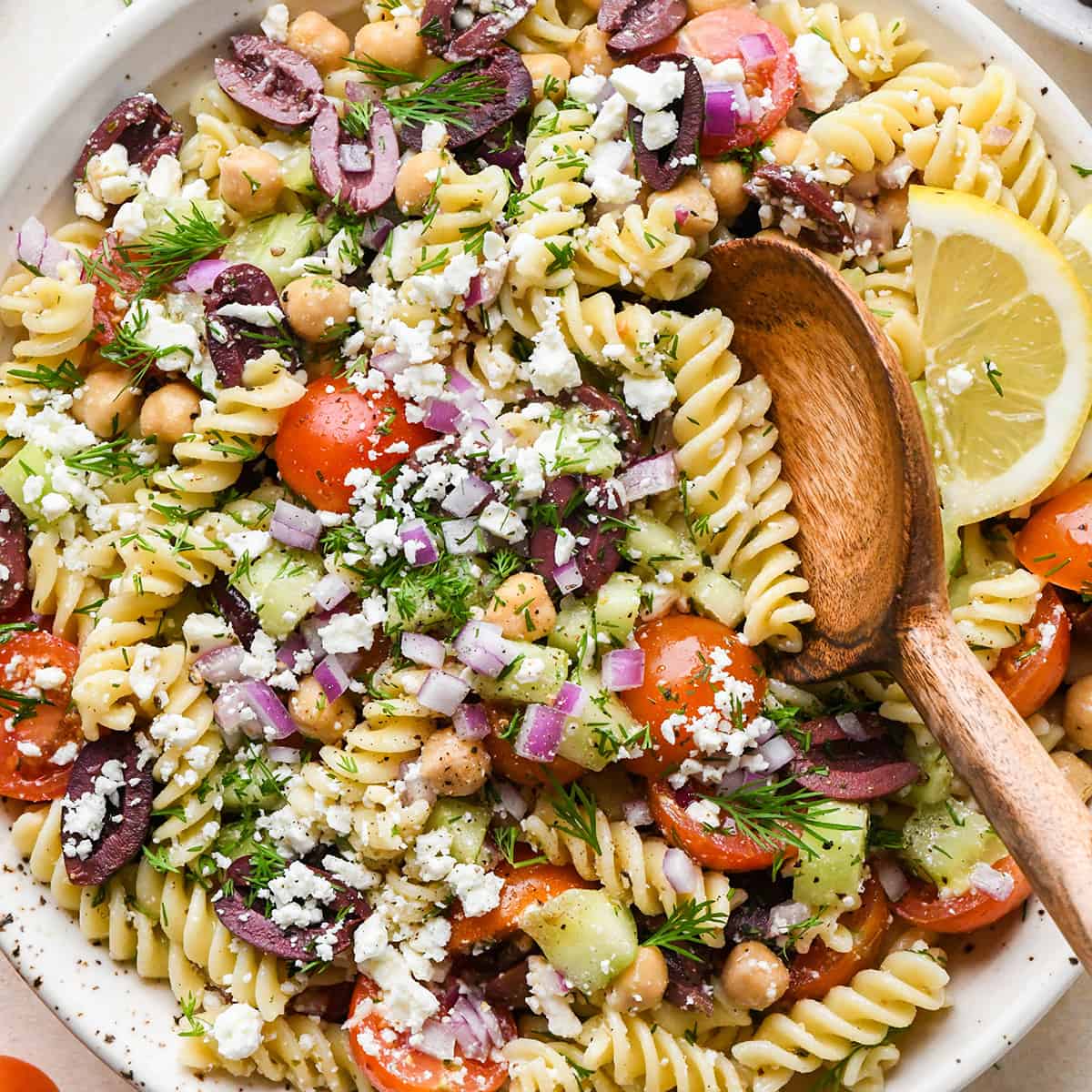 This Greek pasta salad recipe is a true flavor explosion. Pasta is tossed with Kalamata olives, chickpeas, fresh dill, red onion, feta cheese, veggies and a delicious homemade greek dressing for a side that is as bold as it is beautiful.