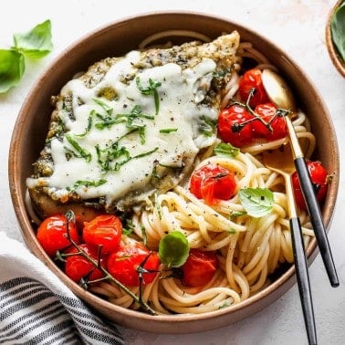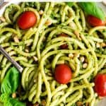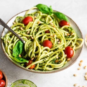 This Pesto Pasta calls for making your own pesto sauce, but don’t let that intimidate you! It’s really easy and only takes 5 minutes to whip up homemade pesto! Mix it into your favorite pasta, add some toasted pine nuts and presto, you have a fresh & delicious meal or side dish ready in 20 minutes! Serve it with this baked pesto chicken! YUM!