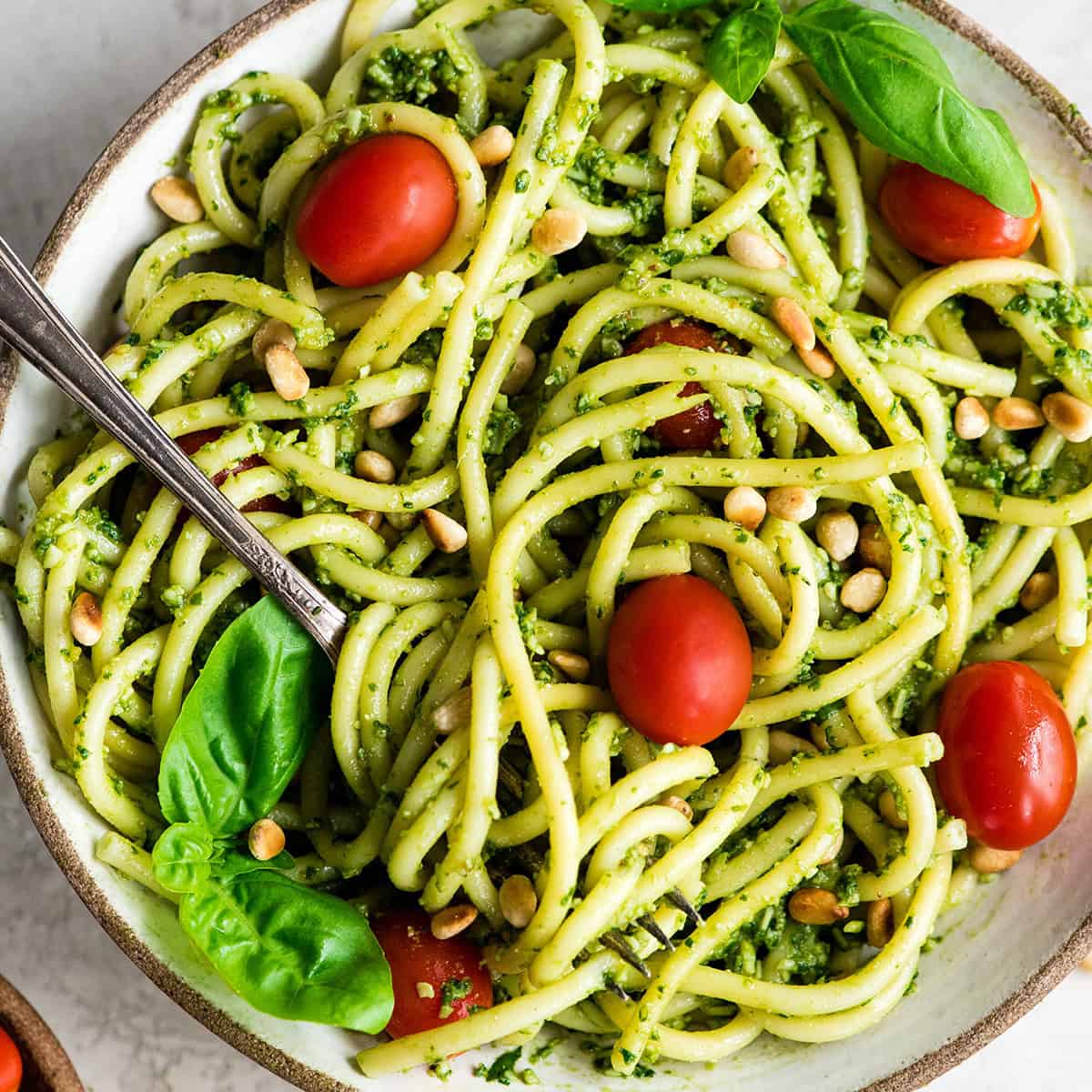 I really enjoy using thick spaghetti noodles (Bucatini) in this pesto pasta recipe! However the sky is the limit with what pasta you can use! Here are some suggestions:
