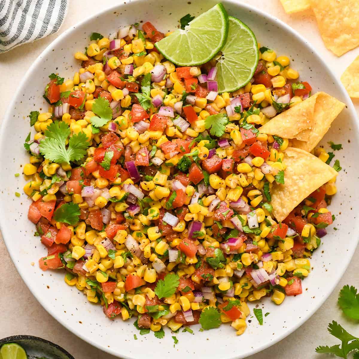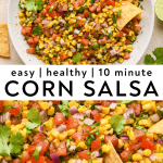 This corn salsa recipe is a light, flavorful, sweet & salty dip that’s a perfect appetizer for taco nights. Plus, it’s easy to make in 10 minutes!