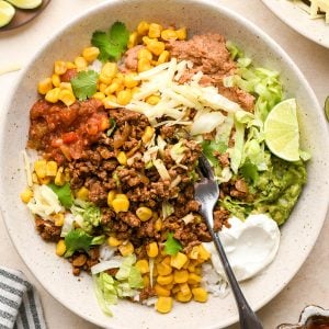 Then, serve the bowls warm with the aforementioned toppings. We love a garnish of fresh cilantro to bring out the fresh, vibrant flavors in this taco bowls recipe!