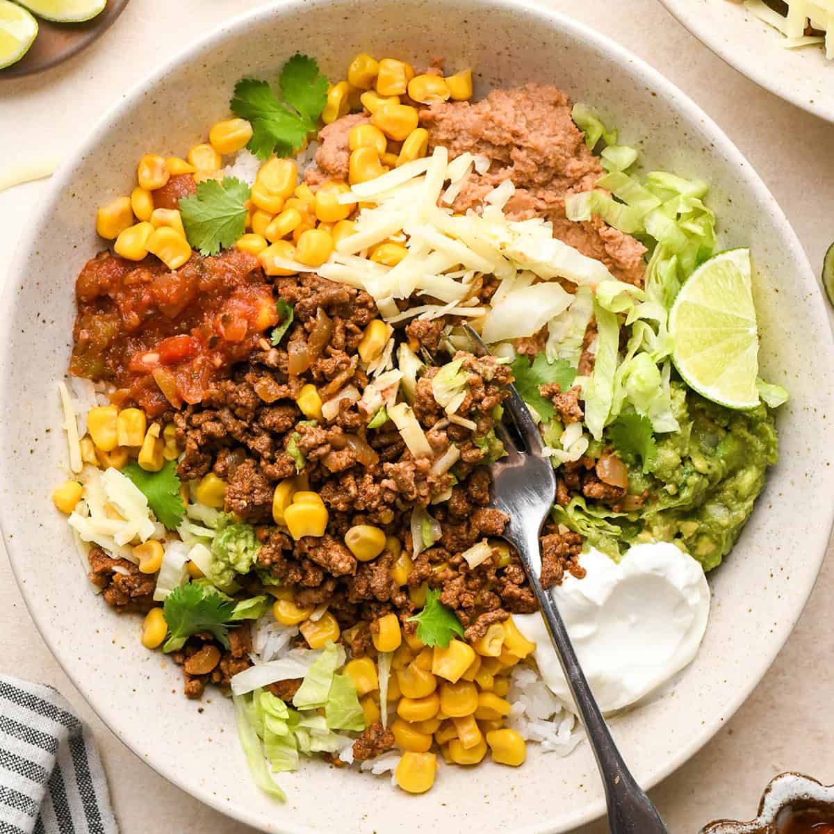 - Layer the ingredients in 4 to 6 bowls, starting with rice on the bottom. Then add refried beans, taco meat and toasted corn. Then, add your desired toppings such as cheese (which I recommend putting on top of the warm ingredients so it will melt slightly), sour cream, guacamole, salsa, fresh cilantro, etc.