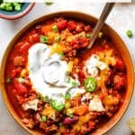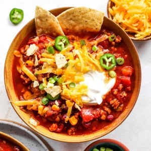 This turkey chili is a healthy alternative to regular chili. It’s loaded with nutrient-dense veggies, protein-packed lean ground turkey and a homemade spice blend that’s flavorful and delicious. Serve with a dollop of sour cream and a sprinkle of cheese for a cozy fall dinner!