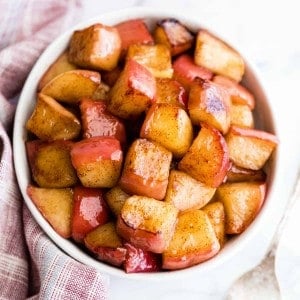 Serve these Cinnamon Apples as a topping over pancakes, scoop them onto some vanilla ice cream or just eat them with a spoon for a healthy sweet treat! They are easy to customize to comply with just about every dietary need.
