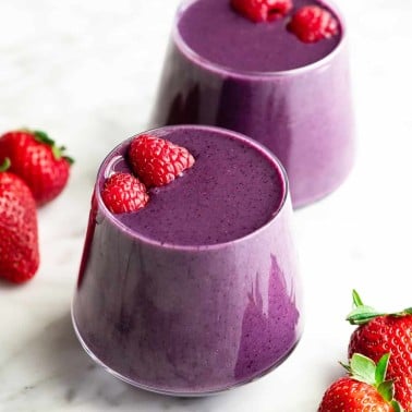 Blend on high speed for 30-60 seconds, or until the mixture is smooth. If using a Vitamix, use the tamper to push the ingredients down into the blades to achieve the best consistency (especially if you are using frozen fruit).