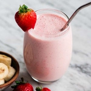 My kids and husband all rave about this healthy Strawberry Banana Smoothie. They loved it and guzzled down every last drop. For a fun twist, add some homemade whipped cream on top.
