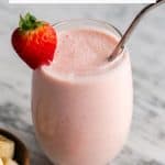 The best strawberry banana smoothie recipe is easy to make with 5 ingredients in less than five minutes. It’s healthy and made with yogurt so it’s full of protein – the perfect snack or breakfast.