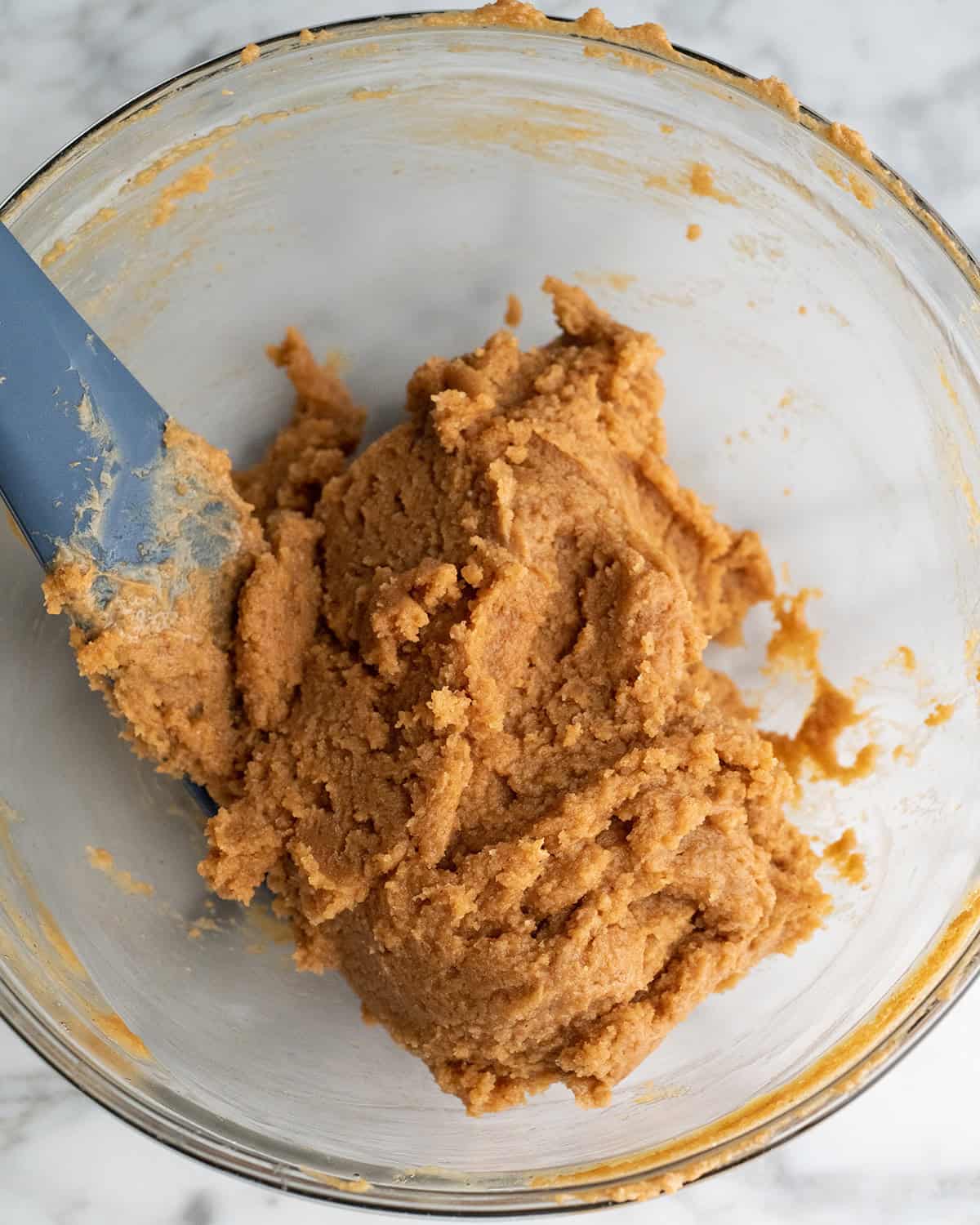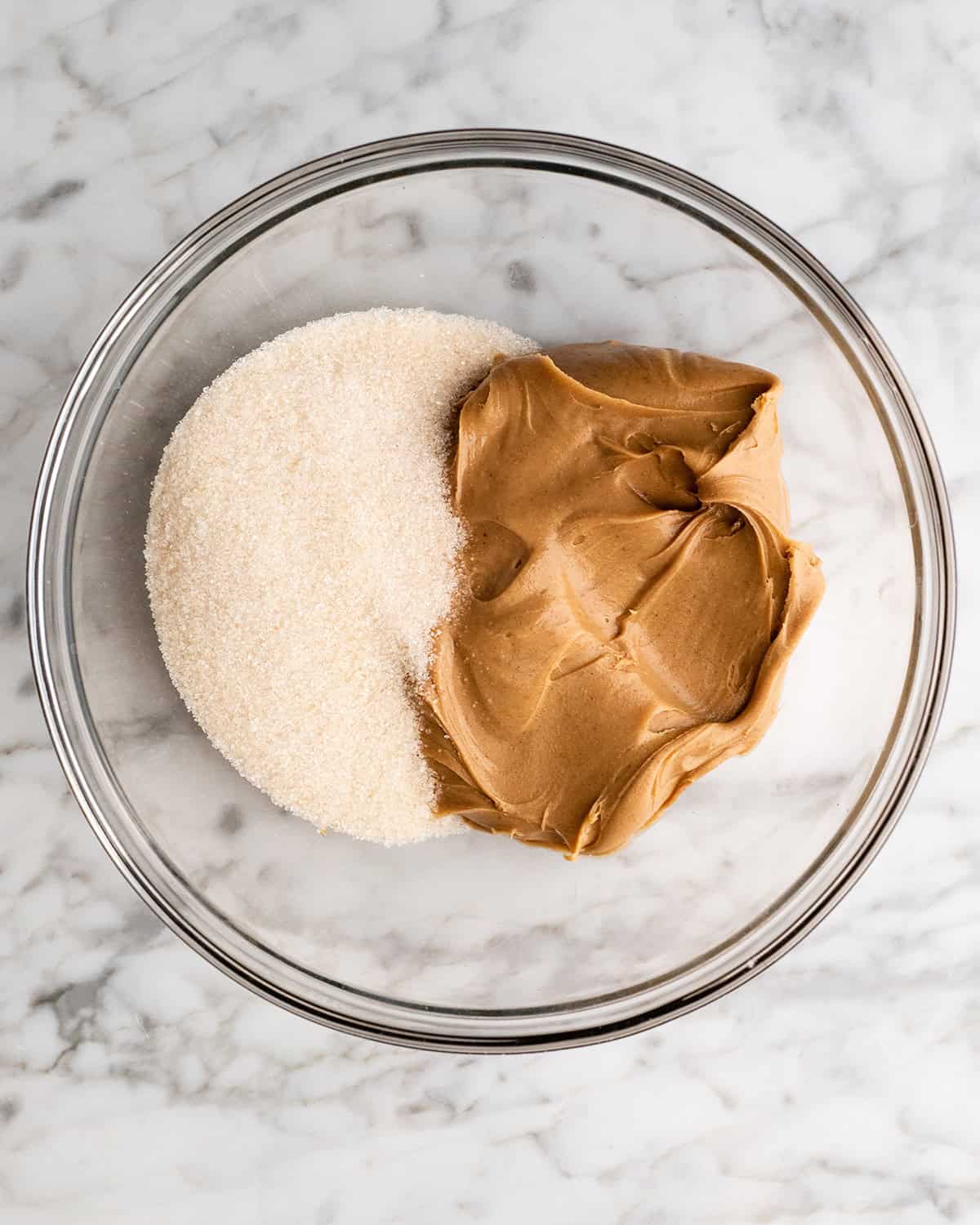 Begin by combining the peanut butter and sugar. You can do this by hand, with a hand-held mixer, or in a standing mixer.