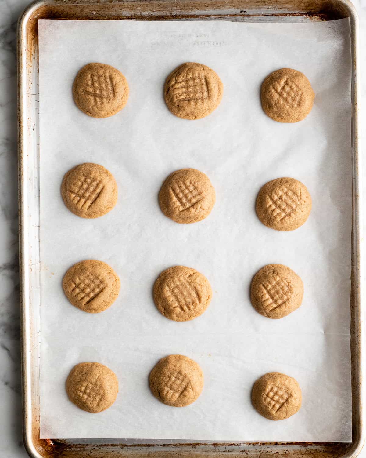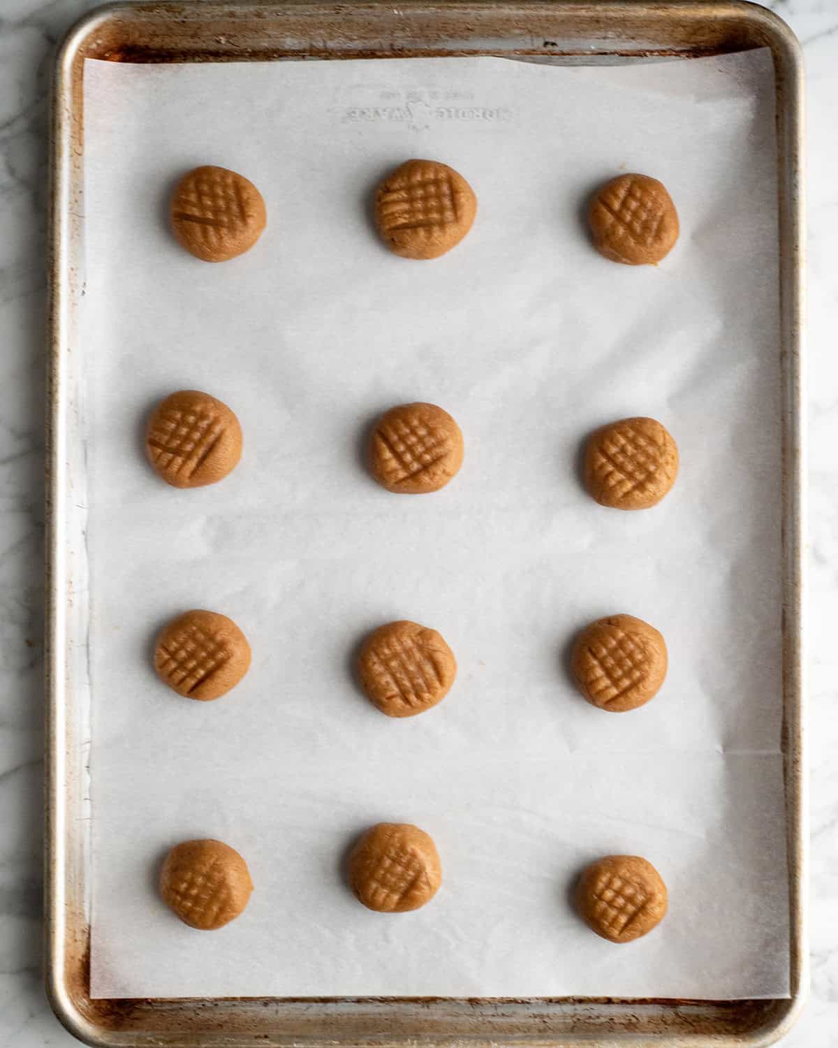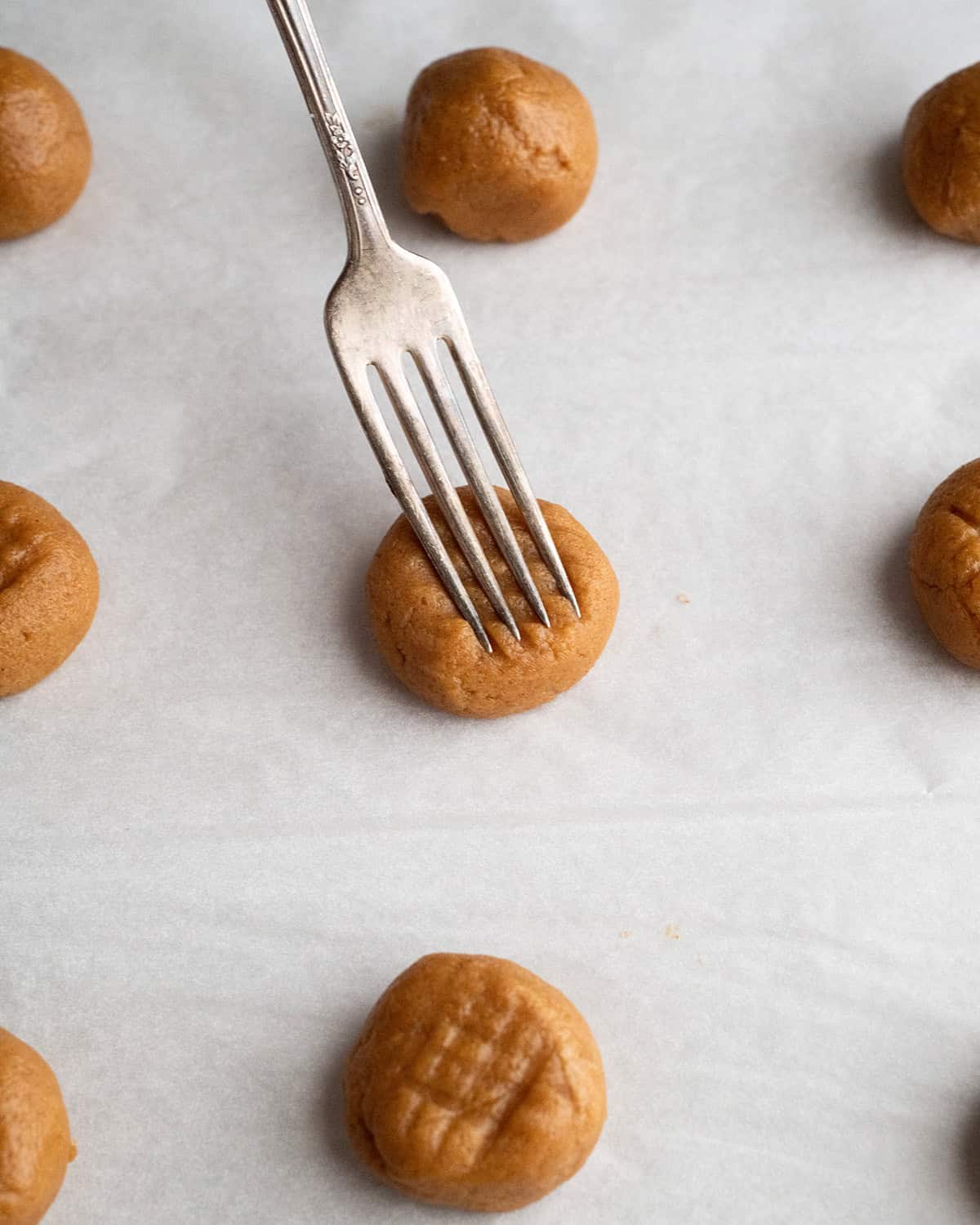 Once the dough is ready to go on the baking sheet, use a fork to make a criss cross pattern on the top of each dough ball, gently pressing it down.